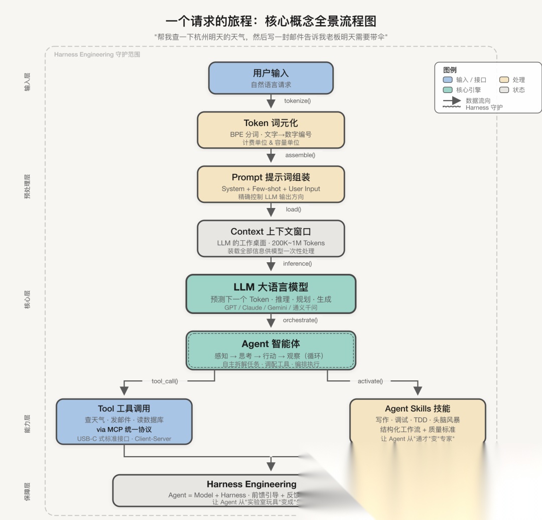 从一个请求出发,走完 AI 应用的全链路,彻底搞懂 Token、Prompt、Context、Tool、MCP、Agent、Agent Skills 和 Harness Engineering。