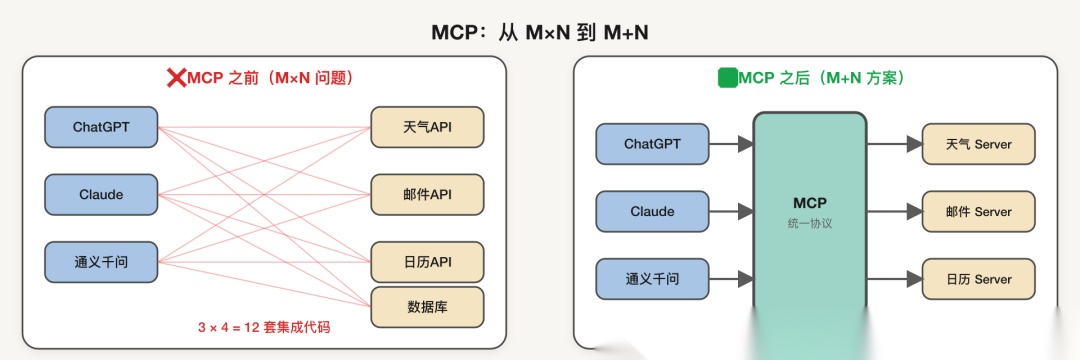 在 MCP 出现之前,Tool 的接入是碎片化的。假设你有 3 个 AI 应用(ChatGPT、Claude、千问)和 5 个工具(天气、邮件、日历、数据库、文件系统),你需要写 3 × 5 = 15 套集成代码。每个 AI 应用都有自己的工具调用格式,每个工具都要为每个平台单独适配。