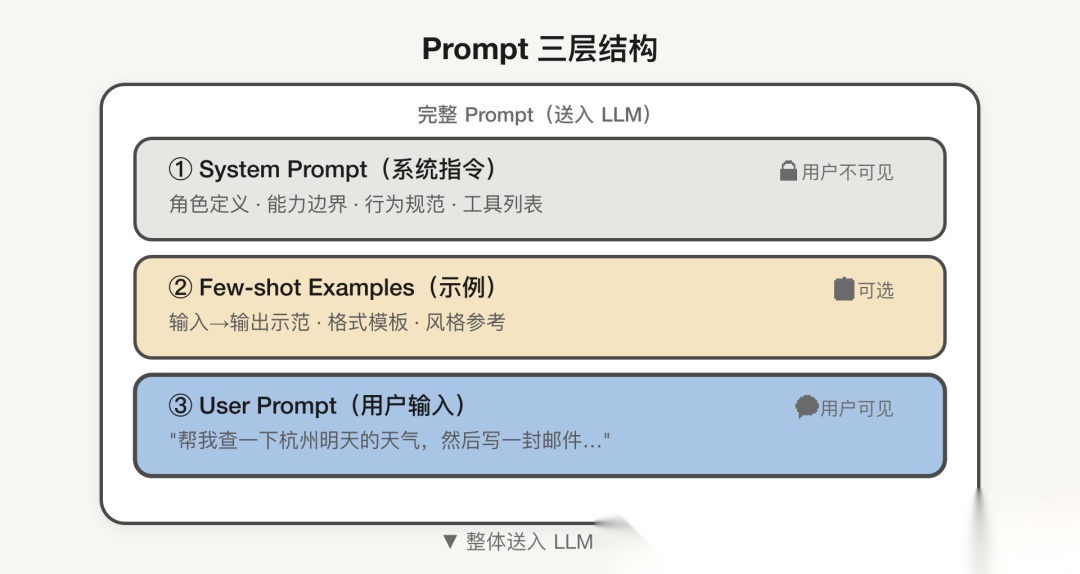 你以为你只是说了一句"帮我查一下杭州明天的天气……“?实际上,在这句话到达 LLM 之前,系统已经在它前面拼接了大量的"隐藏指令”。最终送进 LLM 的完整 Prompt 可能长这样: