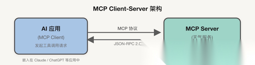 回到旅程:在我们的故事里,AI 助手通过 MCP 协议连接到天气服务的 MCP Server,用标准化的方式查询了杭州的天气。同样的协议,它还能连接邮件服务的 MCP Server 来发送邮件。一个协议,连接一切。