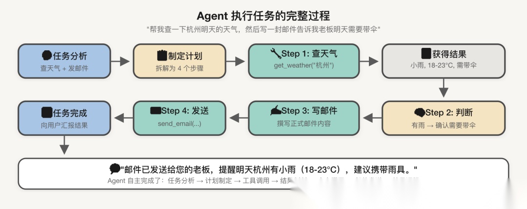 回到旅程:在我们的故事里,Agent 就是那个把"查天气"和"发邮件"串联起来的指挥官。它分析了你的请求,拆解成多个步骤,依次调用工具,最终完成了整个任务链。