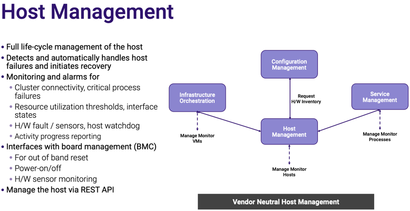 - Responsible for managing and orchestrating the VM carrier grade and high availability capabilities,