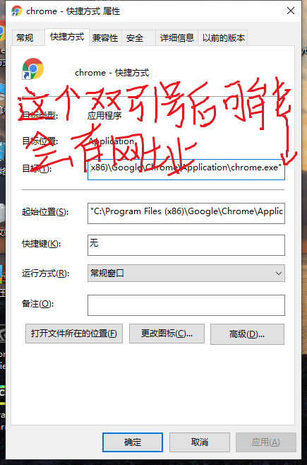 修改浏览器的快捷方式,有人说删除快捷方式属性栏目标位置后的多的网址后缀有效,亲测无效。