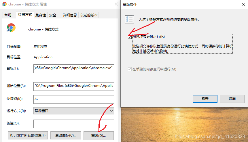 方法二:还是右击浏览器属性,找到高级选项如下图,勾选用管理员身份运行(默认是未勾选),再打开网站就行了。