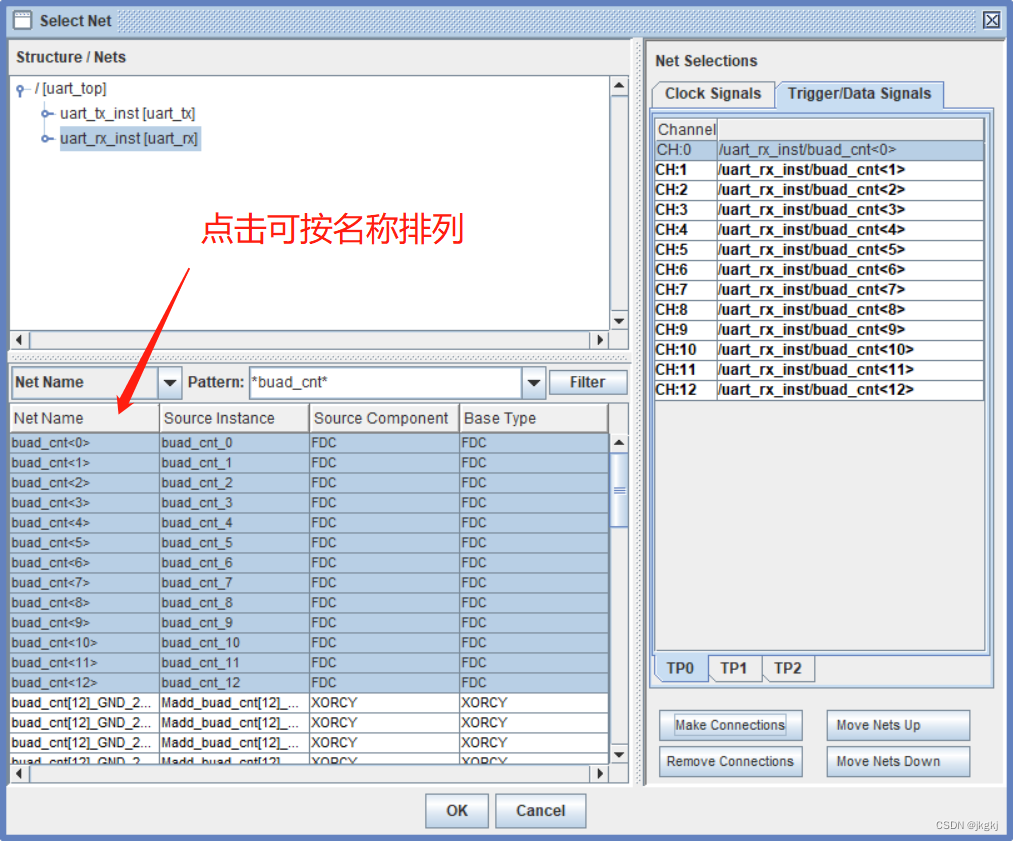 根据相应的端口,填充所需要的信号,这里注意CH0~CHx的填充顺序要正确不要填反了,所以可以点击NET name改变信号的排列顺序,这里选择名为FDC、FDCE对应寄存器的信号。