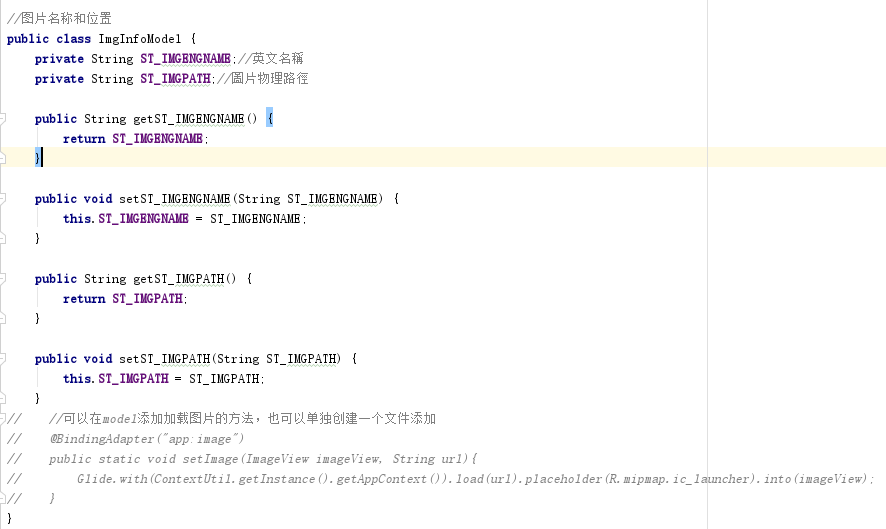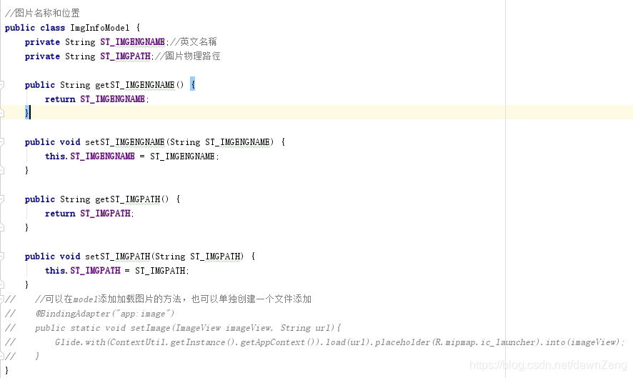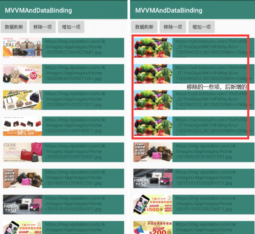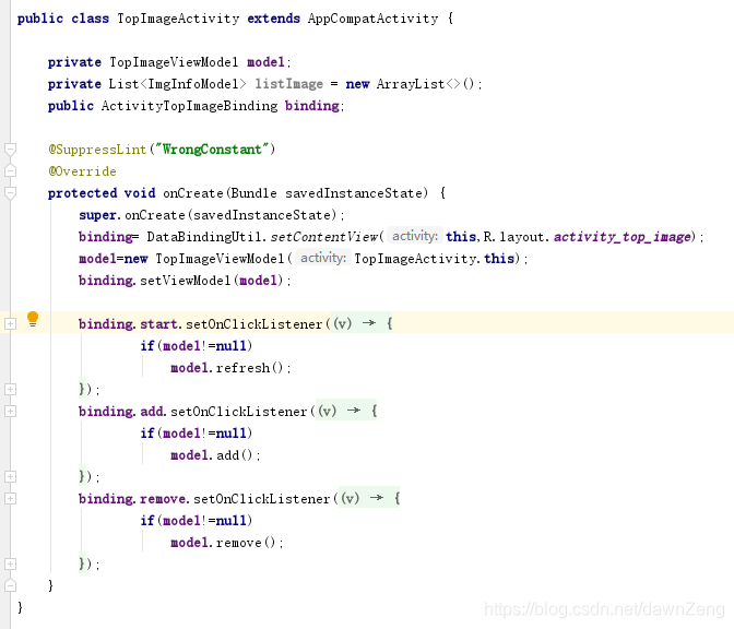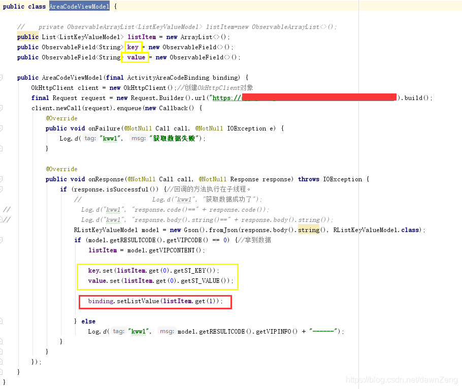 public class TopImageViewModel { private List<ImgInfoModel> listImage = new ArrayList<>(); private List<ImgInfoModel> listImage_refresh = new ArrayList<>(); private DataBindingRecyclerViewAdapter adapter; public TopImageViewModel(final TopImageActivity activity) { OkHttpClient client = new OkHttpClient();//创建OkHttpClient对象 FormBody.Builder forBody1 = new FormBody.Builder();//创建表单请求体 forBody1.add("LANGUAGE", String.valueOf(0));//传递键值对参数 forBody1.add("CURR", "RMB");//传递键值对参数 forBody1.add("NO_DEVICE", String.valueOf(1));//传递键值对参数 FormBody.Builder forBody = new FormBody.Builder();//创建表单请求体 forBody.add("COMMONINFO", String.valueOf(forBody1));//传递键值对参数 forBody.add("TOKENINFO", "");//传递键值对参数 forBody.add("VIPCONTENT", "");//传递键值对参数 Request request = new Request.Builder()//创建Request 对象 .url("https://xxxxxxxxxxxxxxx")//接口 .post(forBody.build())//传递请求体 .build(); client.newCall(request).enqueue(new Callback() { @Override public void onFailure(@NotNull Call call, @NotNull IOException e) { Log.d("kwwl", "获取数据失败----"); } @Override public void onResponse(@NotNull Call call, @NotNull Response response) throws IOException { // Log.d("kwwl", "获取数据成功了----"); // Log.d("kwwl", "response.code()---==" + response.code()); // Log.d("kwwl", "response.body().string()---==" + response.body().string()); RImgInfoModel model = new Gson().fromJson(response.body().string(), RImgInfoModel.class); if (model.getRESULTCODE().getVIPCODE() == 0) { listImage.addAll(model.getVIPCONTENT()); listImage_refresh.addAll(listImage); //Only the original thread that created a view hierarchy can touch its views //翻译过来:只有创建这个view的线程才能操作这个view //在使用Volley的时候这个问题就不怎么会遇到了,那是因为无论是HttpURLConnection还是OkHttp //最终的回调接口,即onResponse运行在子线程 //所以一旦在回调接口对UI进行了操作,将会出现上述提示 //一般来讲,会使用handle解决这个问题 activity.runOnUiThread(new Runnable() { public void run() { adapter = new DataBindingRecyclerViewAdapter(activity, R.layout.item_image, com.dawn.mvvmanddatabinding.BR.imgItem, listImage); activity.binding.recyclerView.setLayoutManager(new LinearLayoutManager(activity, LinearLayoutManager.VERTICAL, false)); activity.binding.recyclerView.setAdapter(adapter); adapter.setOnItemCkickListener(new DataBindingRecyclerViewAdapter.ItemClickListener() { @Override public void itemClick(View view, int position) { Log.e("111",listImage.get(position).getST_IMGENGNAME()+"---"); Toast.makeText(activity, listImage.get(position).getST_IMGPATH()+"----"+position, Toast.LENGTH_LONG).show(); } }); } }); } else Log.d("kwwl", model.getRESULTCODE().getVIPINFO() + "================"); } }); } public void refresh() { listImage.clear(); if (listImage_refresh.size() != 0) listImage.addAll(listImage_refresh); adapter.notifyDataSetChanged(); } public void remove() { if (listImage.size() != 0) listImage.remove(0); adapter.notifyDataSetChanged(); } public void add() { ImgInfoModel p = new ImgInfoModel(); p.setST_IMGENGNAME("我爱吃水果 --新增的图片"); p.setST_IMGPATH("https://ss0.bdstatic.com/70cFvHSh_Q1YnxGkpoWK1HF6hhy/it/u=,&fm=26&gp=0.jpg"); listImage.add(0, p); adapter.notifyDataSetChanged(); } }
