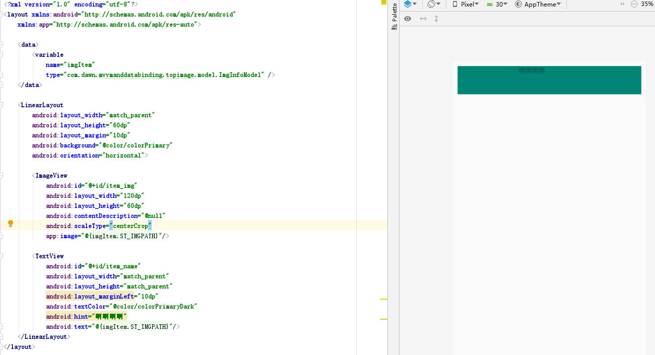 讯享网public class DataBindingRecyclerViewAdapter extends RecyclerView.Adapter<DataBindingRecyclerViewAdapter.ViewHolder> { Context mContext; int mLayoutId; int mVarId; private List mData; public static final int TYPE_HEADER = 1, TYPE_FOOTER = 2, TYPE_NORMAL = 0; boolean haveHeader = false; boolean haveFooter = false; View headerView, footerView; private ItemClickListener itemClickListener; public OnBindingViewHolderListener onBindingViewHolderListener; public DataBindingRecyclerViewAdapter(Context context, int layoutId, int varId, List data) { mContext = context; mLayoutId = layoutId; mVarId = varId; mData = data; } public void setOnItemCkickListener(ItemClickListener listener) { this.itemClickListener = listener; } public void setOnBindingViewHolderListener(OnBindingViewHolderListener listener) { onBindingViewHolderListener = listener; } @Override public ViewHolder onCreateViewHolder(ViewGroup parent, int viewType) { switch (viewType) { case TYPE_HEADER: return new ViewHolder(headerView, viewType); case TYPE_FOOTER: return new ViewHolder(footerView, viewType); case TYPE_NORMAL: return new ViewHolder(LayoutInflater.from(mContext).inflate(mLayoutId, parent, false), viewType); default: return new ViewHolder(LayoutInflater.from(mContext).inflate(mLayoutId, parent, false), viewType); } } @Override public void onBindViewHolder(final ViewHolder holder, final int position) { switch (holder.viewType) { case TYPE_HEADER: break; case TYPE_FOOTER: break; case TYPE_NORMAL: default: ViewDataBinding binding = DataBindingUtil.bind(holder.itemView); Object data; if (haveHeader) { data = mData.get(position - 1); } else { data = mData.get(position); } if (itemClickListener != null) { holder.itemView.setOnClickListener(new View.OnClickListener() { @Override public void onClick(View view) { itemClickListener.itemClick(holder.itemView, position); } }); } binding.setVariable(mVarId,data); binding.executePendingBindings(); if (onBindingViewHolderListener != null) { onBindingViewHolderListener.onHolderBinding(holder, position); } break; } } / * 调用之后请调用NotifyDataSetChange 如果在setAdapter之后 * * @param view */ public void addFooterView(View view) { haveFooter = true; footerView = view; } / * 调用之后请调用NotifyDataSetChange 如果在setAdapter之后 * * @param view */ public void addHeaderView(View view) { haveHeader = true; headerView = view; } public void removeFooterView() { footerView = null; haveFooter = false; } public View getFooterView() { return footerView; } public void cleanData() { mData.clear(); notifyDataSetChanged(); } public List getAllData() { return mData; } public void addData(List data) { mData.addAll(data); notifyDataSetChanged(); } @Override public int getItemCount() { int extraCount = 0; if (haveHeader) { extraCount++; } else if (haveFooter) { extraCount++; } return mData.size() + extraCount; } @Override public int getItemViewType(int position) { if (position == 0 && haveHeader) { return TYPE_HEADER; } else if (position == mData.size() && haveFooter) { return TYPE_FOOTER; } else { return TYPE_NORMAL; } } public class ViewHolder extends RecyclerView.ViewHolder { int viewType; public ViewHolder(View itemView, int viewType) { super(itemView); this.viewType = viewType; } } public interface ItemClickListener { void itemClick(View view, int position); } public interface OnBindingViewHolderListener { void onHolderBinding(ViewHolder holder, int position); } }