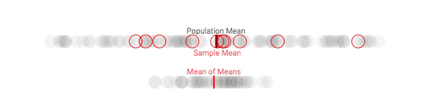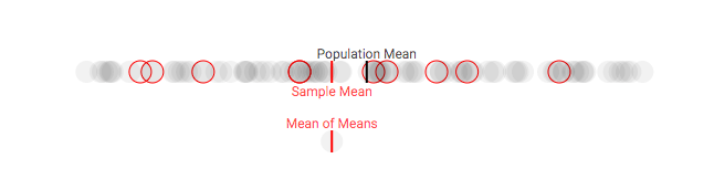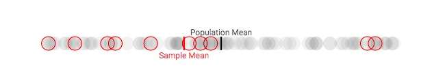 假设我们可以从团体中采集多个样本。虽然这种做法在现实中是客观存在的(尤其是在政治民意调查中),但在这里,我们会更多地将其作为一种解释工具(当你进行重复采样时,实际上会有一些意料之外的因素出现)。对于每个样本,我们在每次采样时都跟踪样本均值与整体平均值的差。