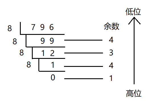 例:796(十进制)→ 1434(八进制)