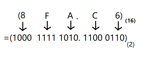 例:8F6.C6(十六进制) → 1000 1111 1010.1100 0110(二进制)