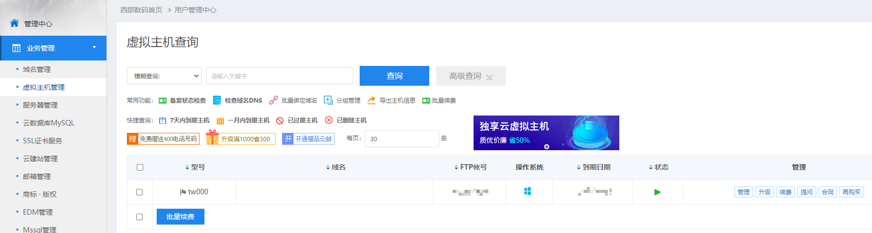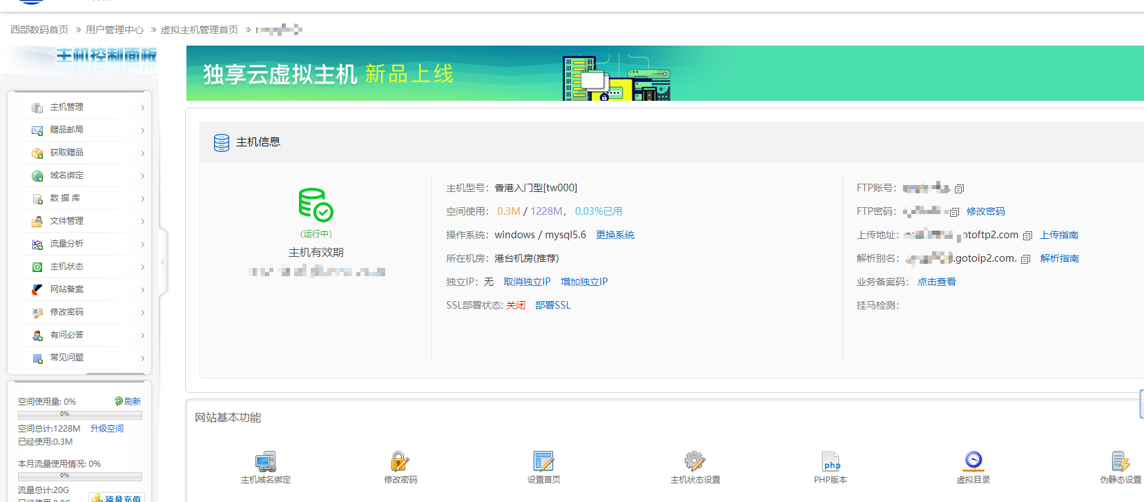 点击 虚拟主机管理 中的 管理 进入 虚拟主机页面