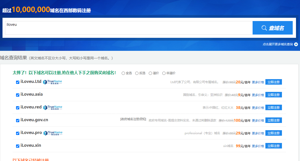 点击官网首页的 域名注册 跳转页面至 域名注册界面 填写你想要的域名 点击查域名