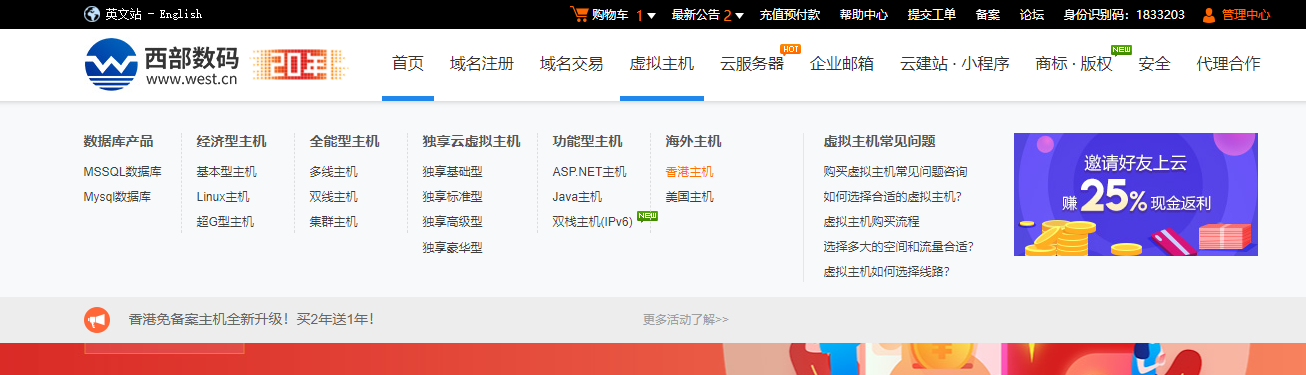 域名注册 和 虚拟主机租用 都是在 西部数据 进行的