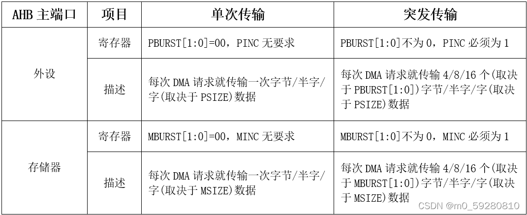 突发传输就是用非常短时间结合非常高数据信号率传输数据,相对正常传输速度,突发传输就是在传输阶段把速度瞬间提高,实现高速传输,在数据传输完成后恢复正常速度,有点类似达到数据块“秒传”效果。为达到这个效果突发传输过程要占用 AHB 总线,保证要求每个数据项在传输过程不被分割,这样一次性把数据全部传输完才释放 AHB 总线,此时不可被打断;而单次传输时必须通过 AHB 的总线仲裁多次控制才传输完成。