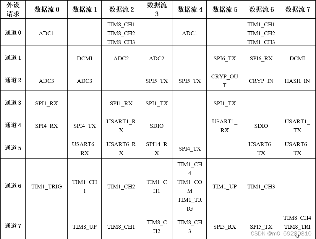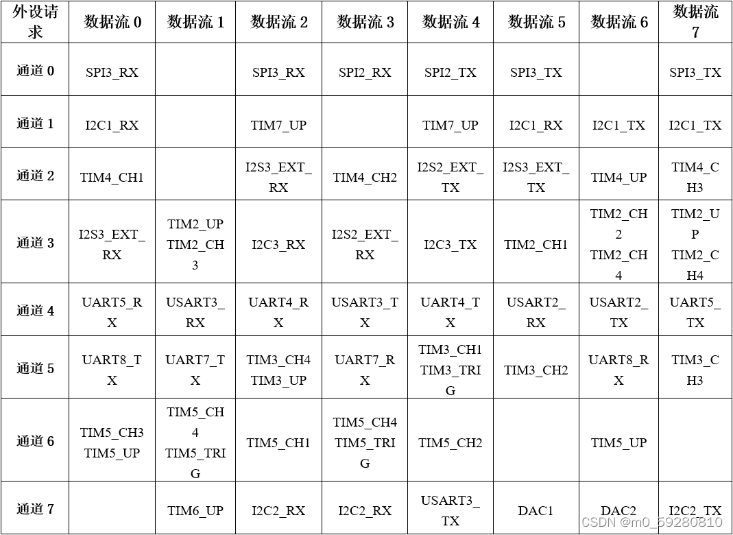 DMA控制器 通过DMA数据流x配置寄存器DMAA_SxCR(x为0-7 对应的是8个DMA数据流)的CHSEL[2:0]位来选择对应通道作为数据流的目标外设,下面是DMA1 DMA2对应通道的映射关系