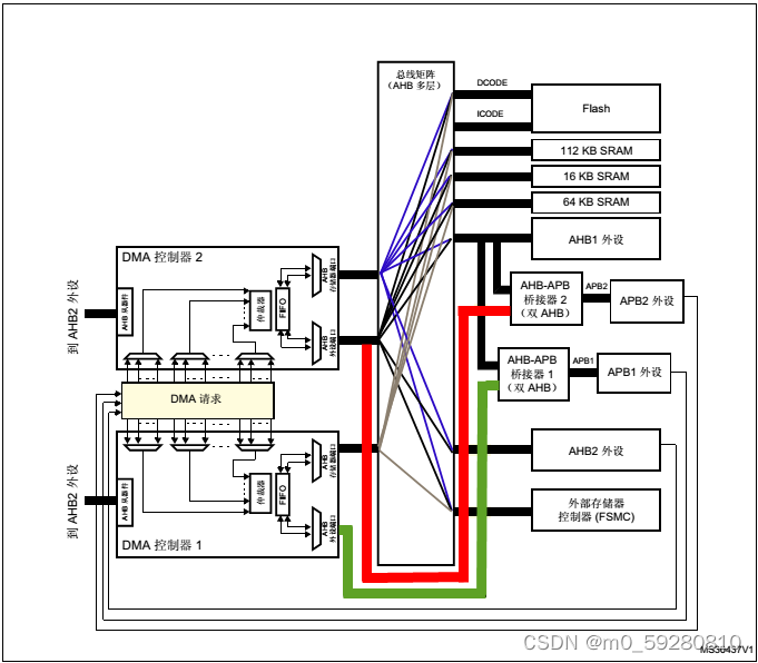 DMA2除了可以实现上述功能外,还能实现M->M (flash->SRAM),这是因为DMA2通过总线矩阵连接了FLASH 和SRAM的,而DMA1是直接连在了外设上。从下图中可以看出,DMA1的存储区端口比DMA2减少了AHB2外设的访问权,同时外设端口没有连接总线矩阵,所以DMA1是不能将存储器之一作为外设来实现存储器到存储器的传输的。