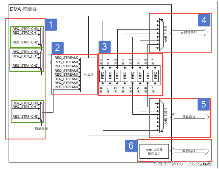 每个DMA有8个数据流,每个数据流又有8个通道(有的只有6个或7个),每个通道都有一个仲裁器,用于处理DMA的优先级。