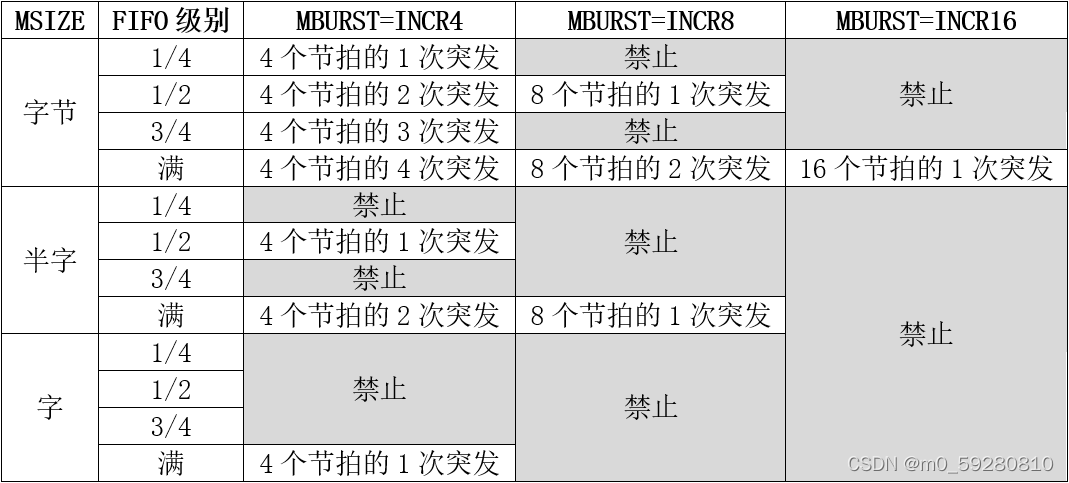 这4个字节又怎么传呢? 一个一个传还是打包成一个字来传? 这需要配置MBURST/PBURST。突发传输与 FIFO 密切相关,突发传输需要结合 FIFO 使用,具体要求 FIFO 阈值一定要是内存发传输数据量的整数倍。FIFO 阈值选择和存储器突发大小必须配合使用,具体参考下表。