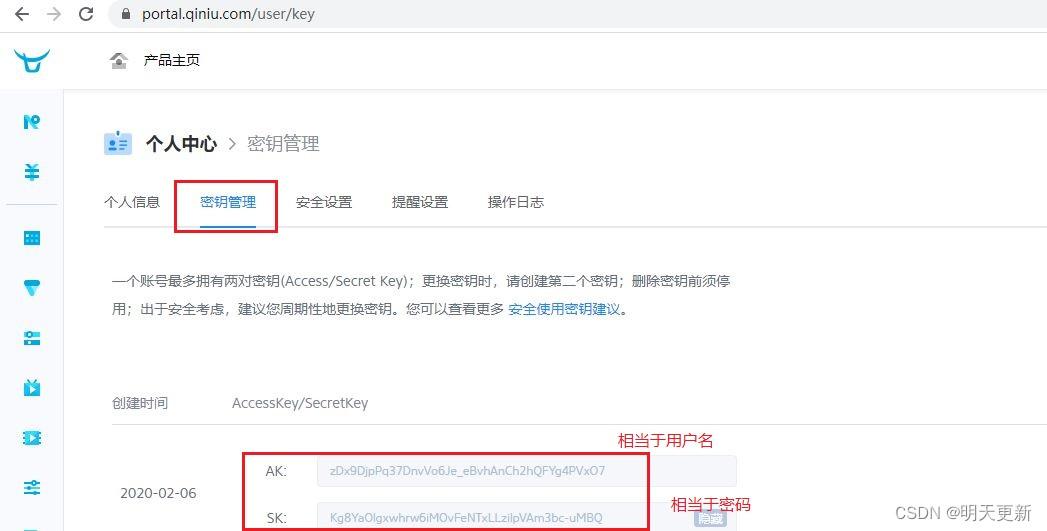 Java SDK的所有的功能,都需要合法的授权。授权凭证的签算需要七牛账号下的一对有 效的Access Key和Secret Key,这对密钥可以在七牛云管理控制台的个人中心 (https://portal.qiniu.com/user/key)获得,如下图: