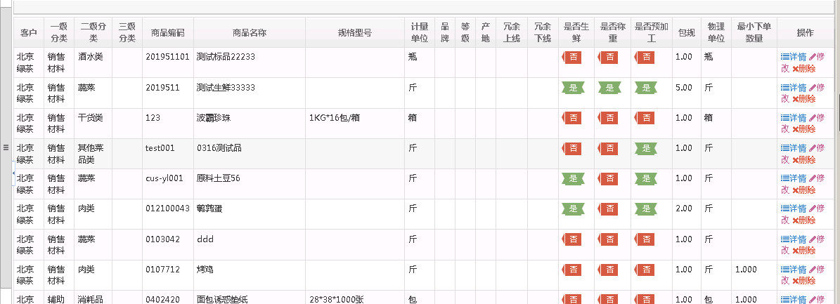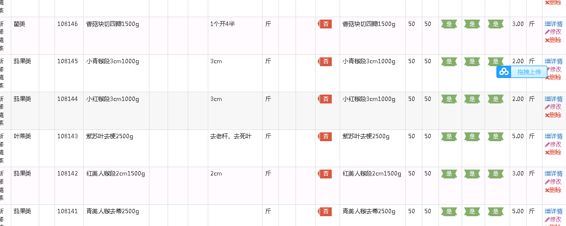 商品数据包括生鲜和标品两部分,生鲜就是蔬菜,标品就是指的干调。商品的数据属性包括商品编码,名称,规格,单位,重量,价格等属性。如下图
