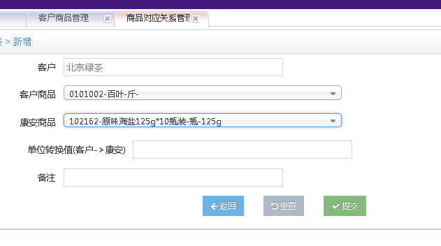 客户商品和主数据一样,只是每个客户有自己的一套商品数据,包括商品编码,名称,基础数据等。例如同样的商品,西贝和绿茶,都有自己的编码和名称。