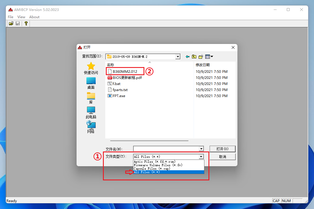 在AMIBCP中打开文件时文件类型需选择“all files”。
