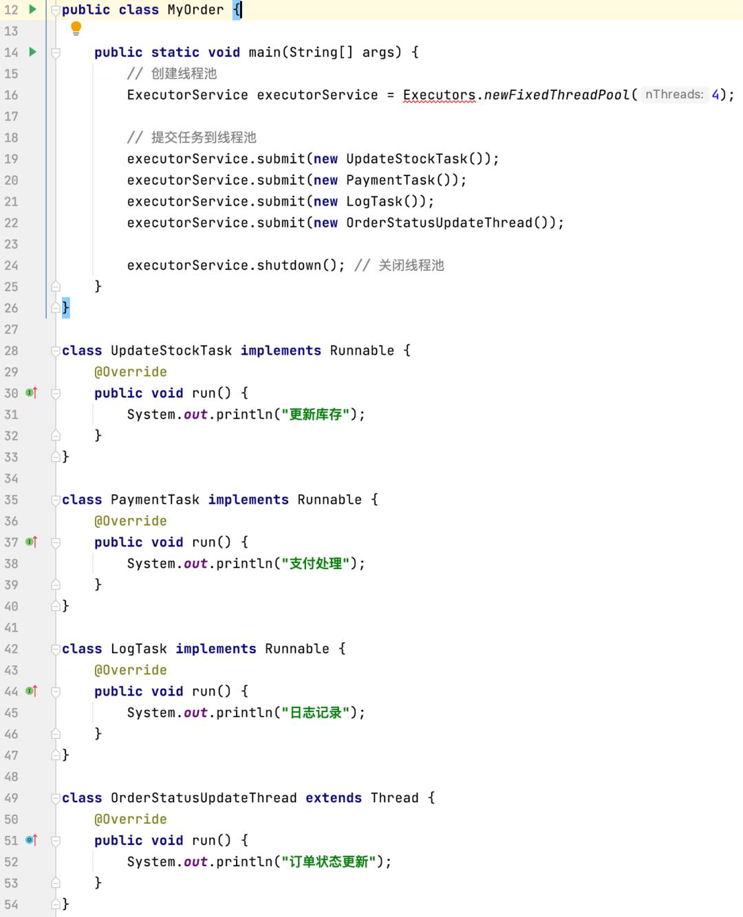 我们可以使用实现 Runnable 接口的方式来处理库存的更新、支付的处理和日志的记录,因为这些操作是独立的,不需要返回结果。同时,我们可以使用继承 Thread 类的方式来处理订单的状态更新,因为订单状态更新需要继承订单类并重写 Thread 类的run() 方法来执行订单状态更新的逻辑。
