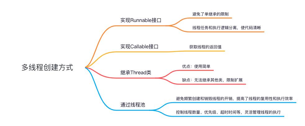- 实现 Runnable 接口和继承 Thread 类是两种最常见的多线程创建方式,适合简单的多线程任务,不需要返回结果或者控制线程的其他属性时使用。