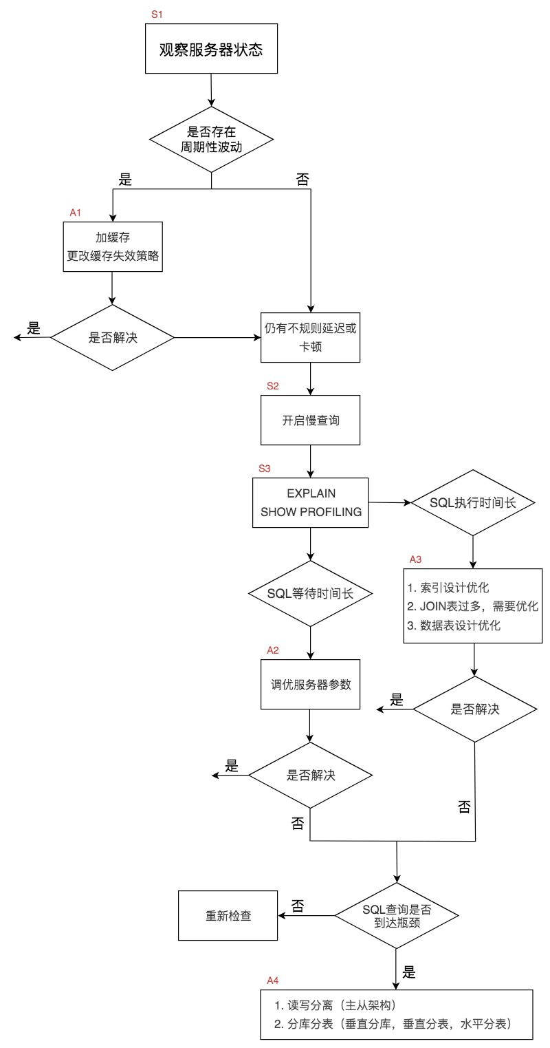 首先在 S1 部分,我们需要观察服务器的状态是否存在周期性的波动。如果存在周期性波动,有可能是周期性节点的原因,比如双十一、促销活动等。这样的话,我们可以通过 A1 这一步骤解决,也就是加缓存,或者更改缓存失效策略。如果缓存策略没有解决,或者不是周期性波动的原因,我们就需要进一步分析查询延迟和卡顿的原因。