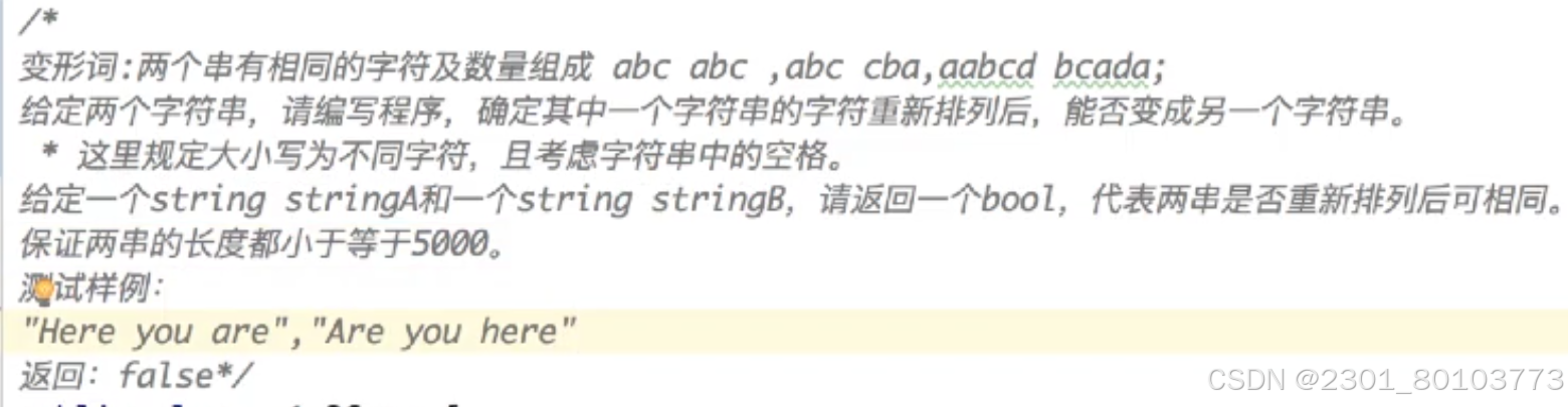 用每个字符的ASCll码值作为索引进行记录,开辟一个辅助空间,一个数组加,一个数组减,要减的位置如果计数为0,就不用减,直接返回false,因为计数为0就代表上一个字符串没有这个字符。处理完两个数组后,扫描辅助空间,遇到不是0的,返回false