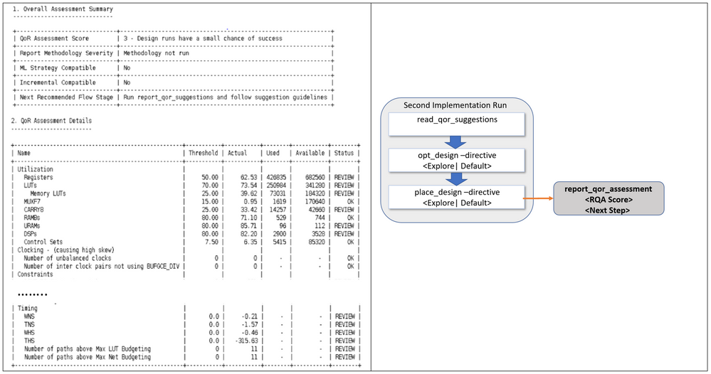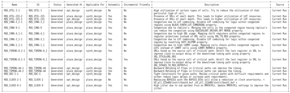 在此阶段,我们必须运行 place_design 并运行这些建议,以便使改进生效。请注意 RQS 建议表,其中部分建议适用于 synth_design。 其中许多综合建议与 place_design 建议重叠,因此您可任选其中之一运行。
