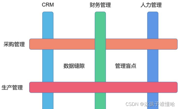 逐渐的,企业构建的一个个针对业务环境支撑的系统,如OA、HR、财务系统、采购系统、生产系统等,形成了竖井式“烟囱”。