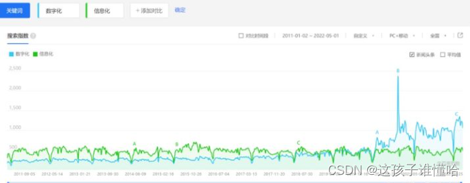 百度指数,数字化在2020年左右超越了信息化的搜索热度。