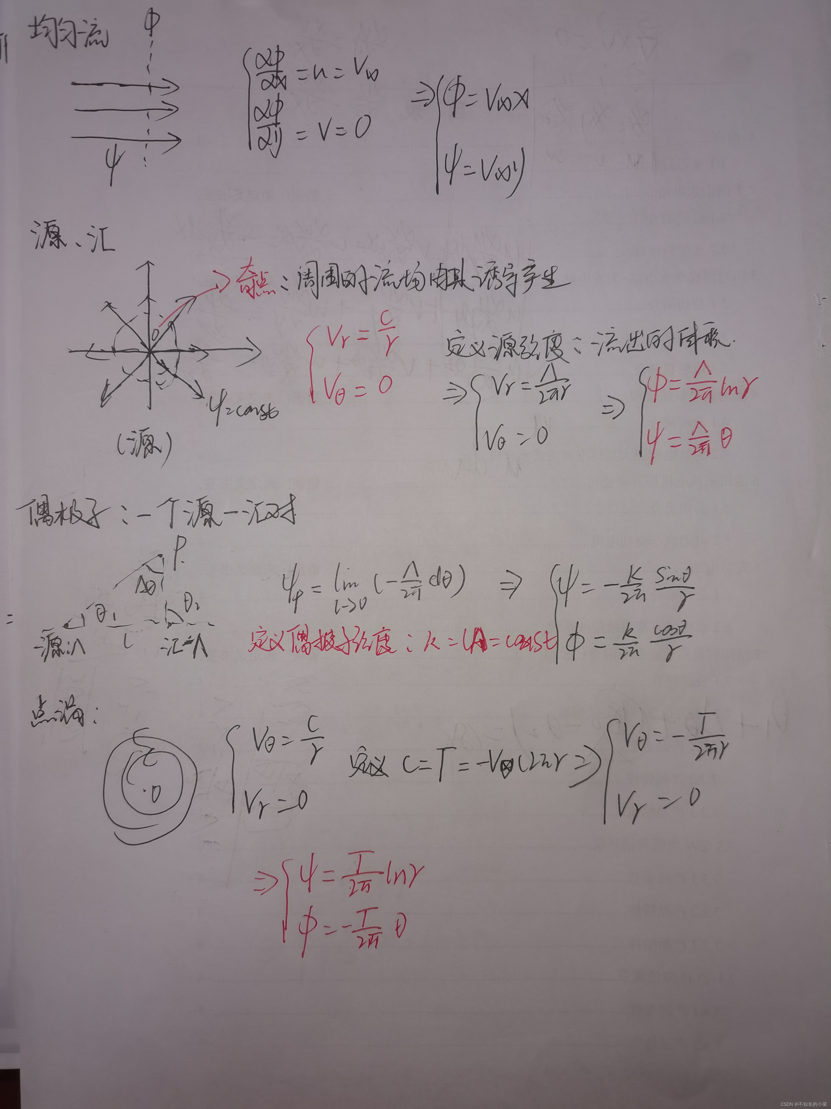 均匀流动、源汇流动、偶极子流动、点涡流动。在源汇流动、偶极子流动和点涡流动中都涉及到一个概念即奇点,这一点的速度并不满足其流场规律,书上定义其流场是奇点诱导产生,对于这个概念我暂时没有完全理解,先在这里打个问号。