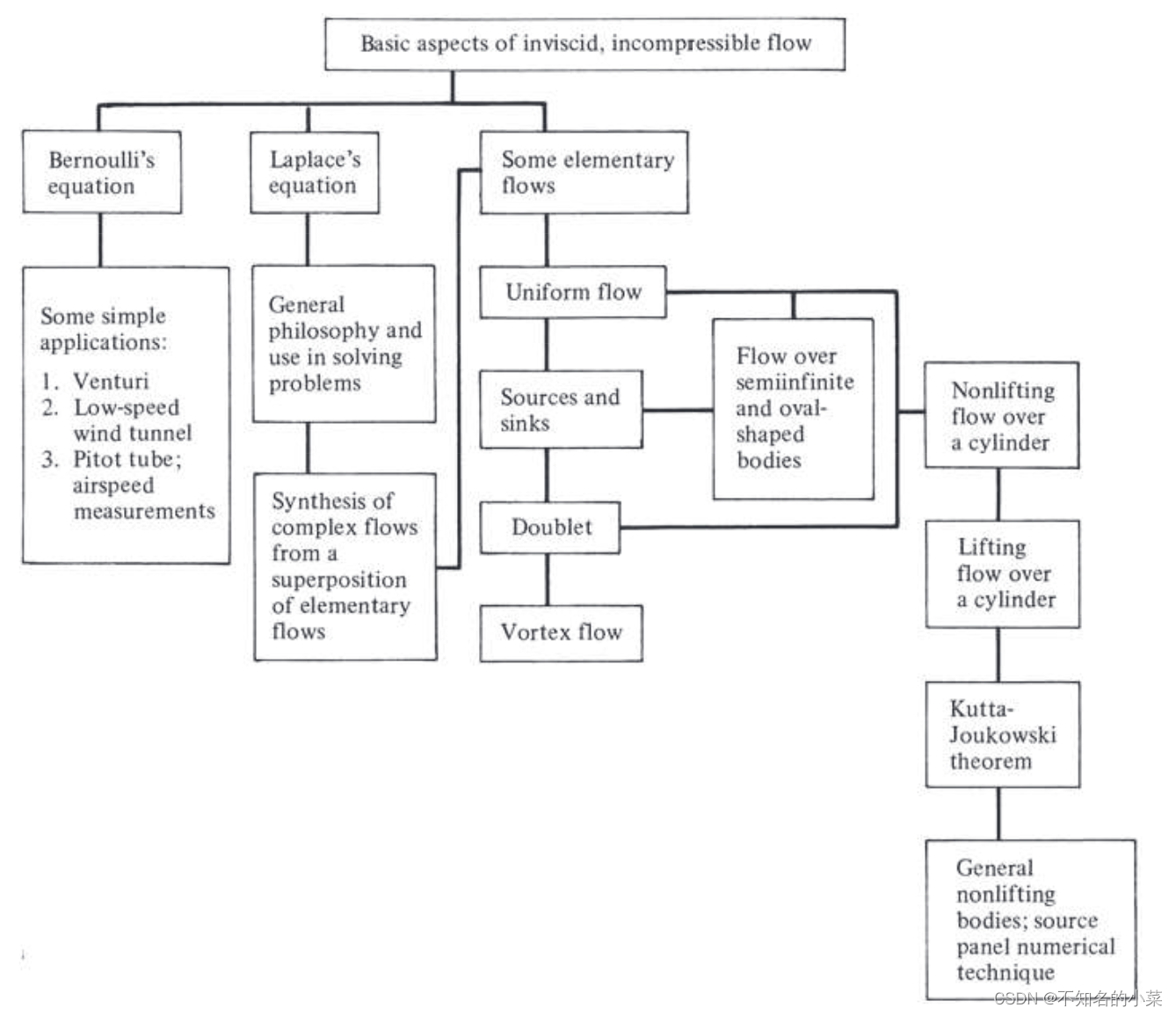 理论流体力学一般分为两个分支,一个处理无黏性流动或理想流动,另一个处理黏性流动。研究无黏性流动中的定理和原理对许多自然流动来说是近似准确的。本章的内容主要是无黏、不可压缩流动的基本原理。具体内容路线图如下: