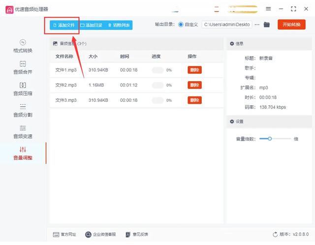 2.点击“添加文件”,上传需要调整音量的音频文件。