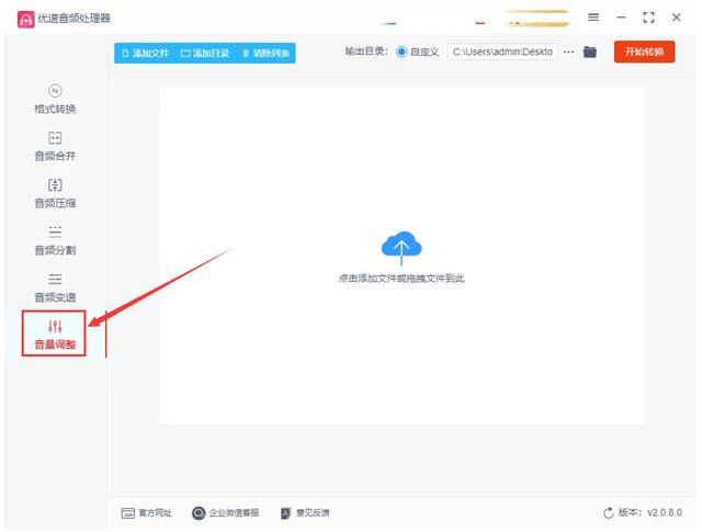 首先,为了确保后续操作顺利进行,请先在您的计算机系统中进行“优速音频处理器”软件的下载与安装。安装完毕并成功启动该软件后,屏幕左侧将会显示出六大实用功能选项,欢迎各位对各个功能产生好奇心的朋友们前去尝试体验。但今日我们的主要任务则是操作其中的【音量调整】功能。