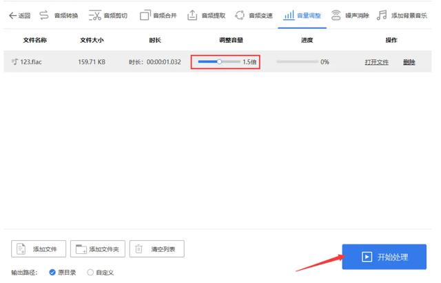 3.在界面中可以看到一个“调整音量”的选项,点击后会出现一个弹窗,可以在这里选择需要放大的声音次数和倍数。选择完成后,点击“开始处理”按钮,稍等片刻就可以完成音频的音量调整了。