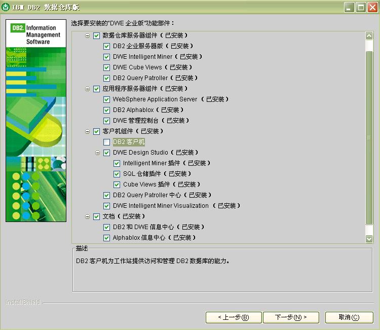 点下一步,系统会列出详细的功能组件。记得去掉db2客户机的选择,否则系统会提示你不能同时安装db2server和客户机,点两次下一步,安装开始。
