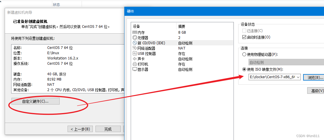 6.注意,不要着急点击完成,先选择自定义硬件-新cd/dvd将官网下载的镜像文件加载到这里即可点击完成