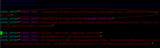 JAVA_OPTS="$JAVA_OPTS -javaagent:/home/eqs/soft/skywalking5/agent-mall_web/skywalking-agent.jar"