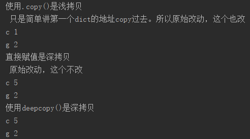 j={'c':1,'g':2} p=j.copy() j['c']=5 print("使用.copy()是浅拷贝",'\n',"只是简单讲第一个dict的地址copy过去。所以原始改动,这个也改") for k,v in p.items(): print(k,v) u = j j['c'] = 5 print("直接赋值是深拷贝", '\n', "原始改动,这个不改") for k, v in u.items(): print(k, v) from copy import deepcopy h=deepcopy(j) j['c'] = 55 print("使用deepcopy()是深拷贝") for k, v in h.items(): print(k, v)