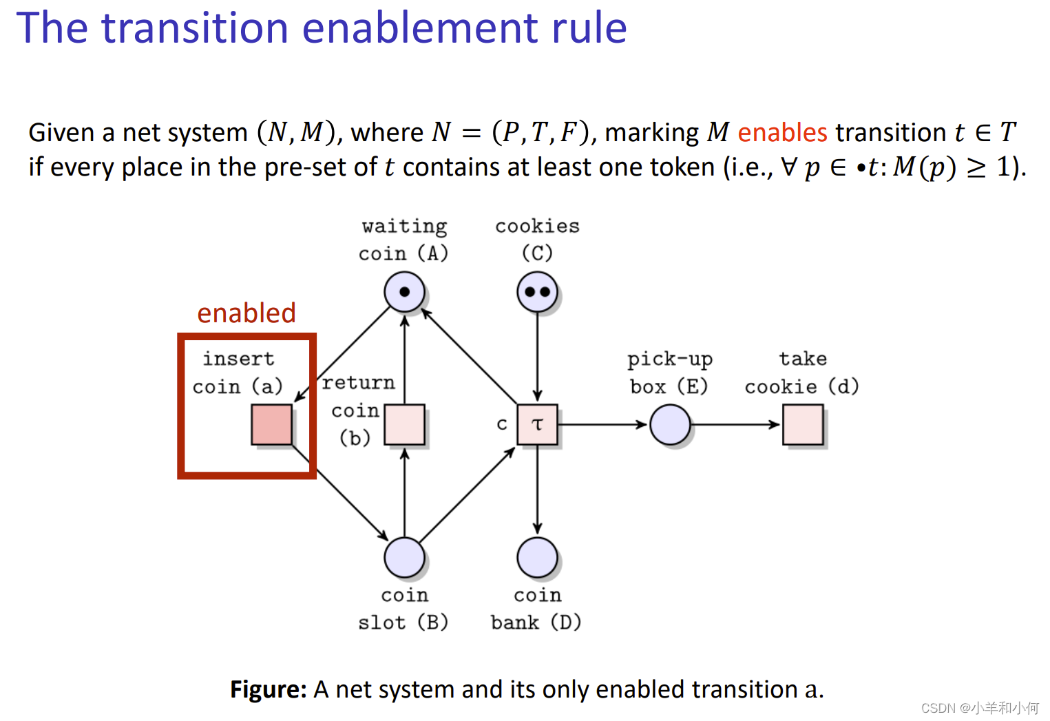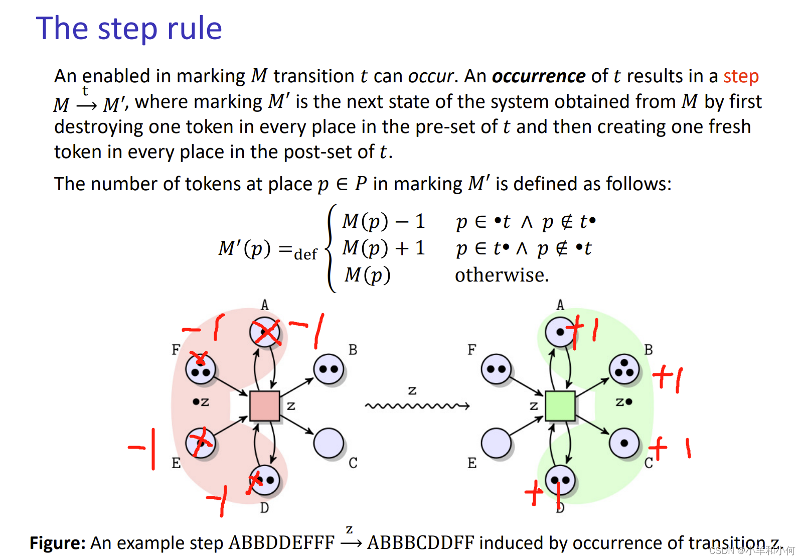 - 一个网状系统的几个过渡可以同时被启用,但只有一个被启用的过渡会被非确定性地选择发生。