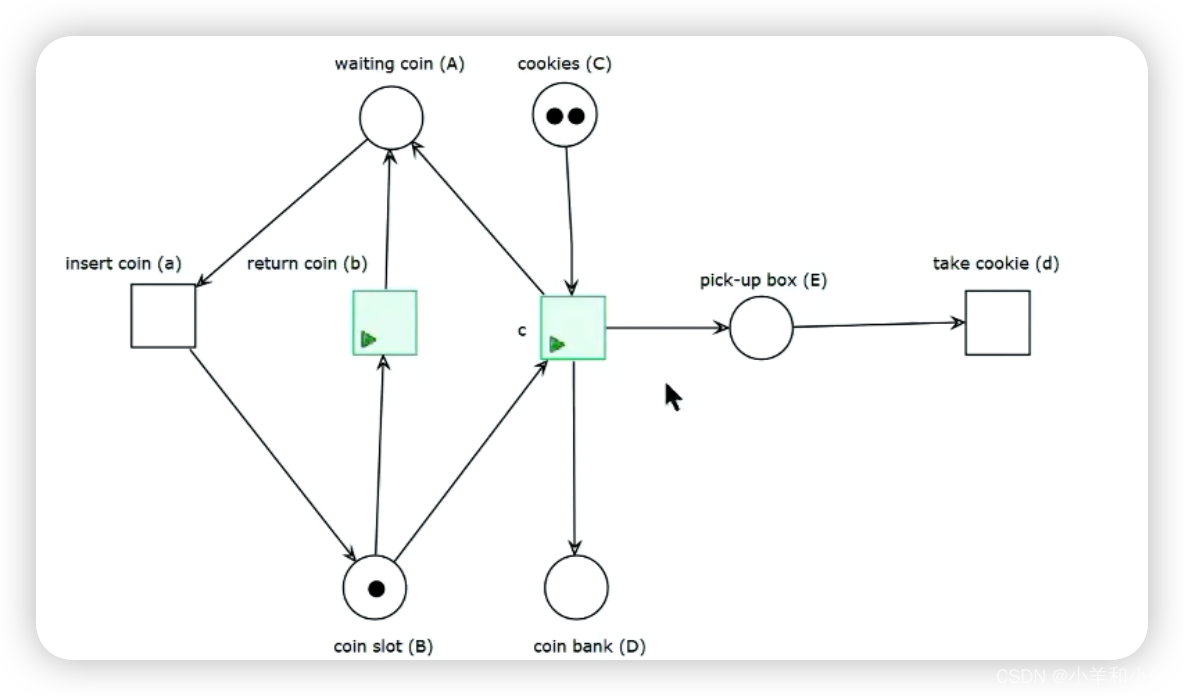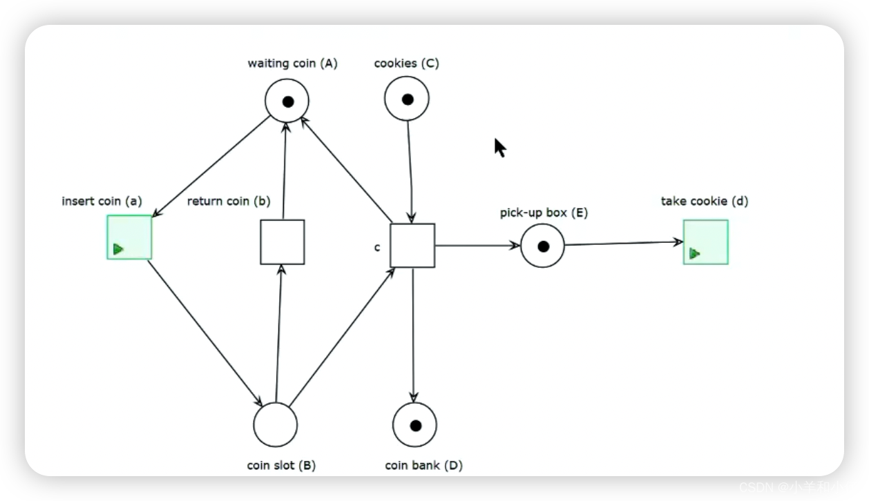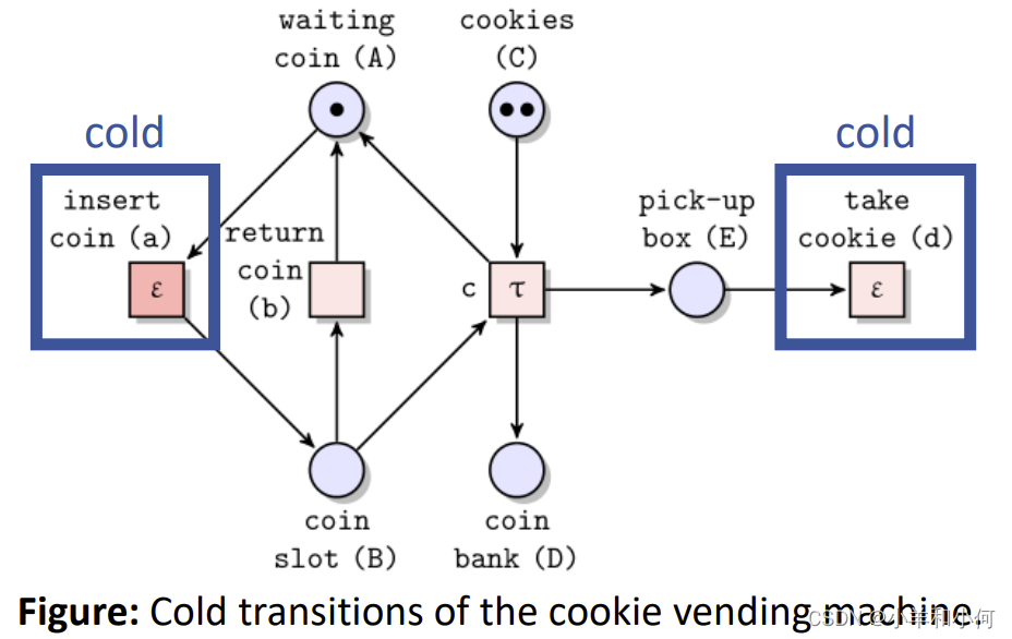 到目前为止,我们假设一个启用的过渡最终会变成禁用,或者发生。 对于返回硬币(b)和c的转换来说,这确实是真实的,它们是系统内部的。 例如,投币口中的硬币最终会被转移到硬币库或被退回。 我们把这种转换称为热转换。然而,在现实世界中,插入硬币(a)和取走饼干(d)的转换是由顾客(外部系统)触发的,而且不能保证它们是否会发生。 我们把这种过渡称为冷过渡,并用B表示。冷过渡很少见,经常出现在与环境的接口处。