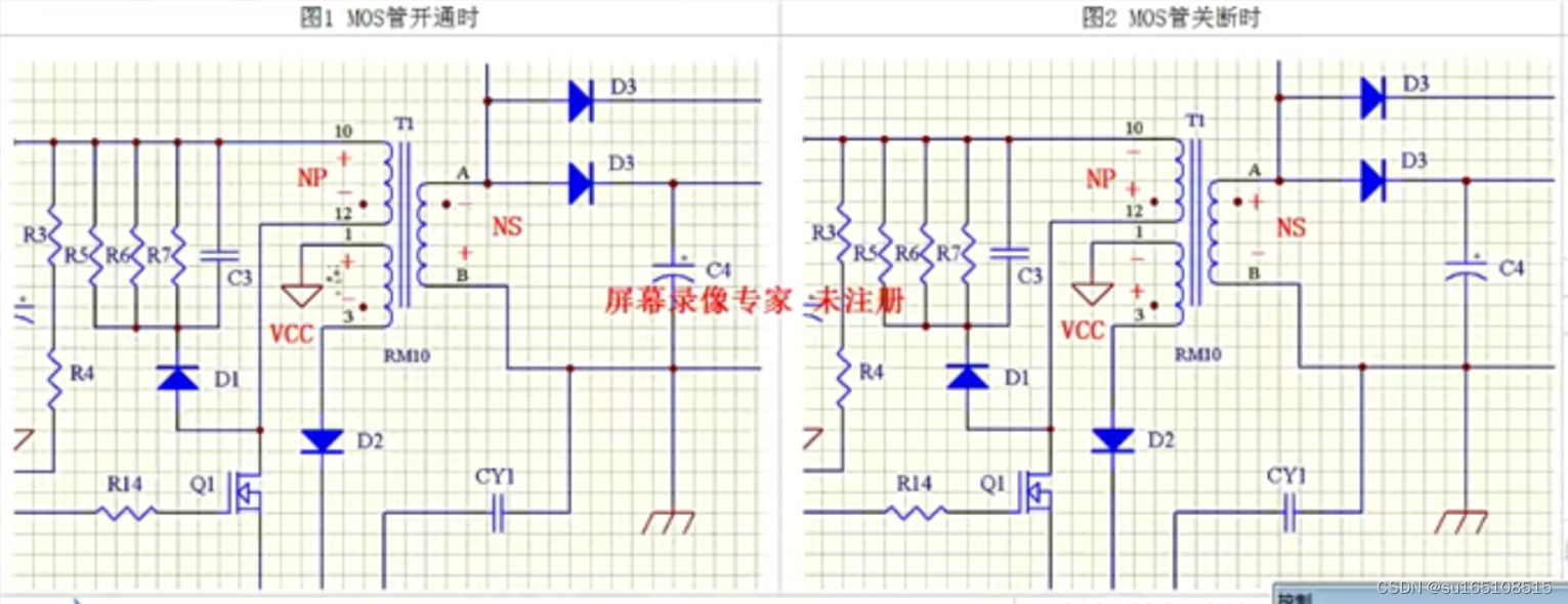 如图1,当MOS管开通时,初级绕组NP,次级绕组NS,IC供电绕组VCC,感应电动势方向,10、1、B为+端,12、3、A为–端,