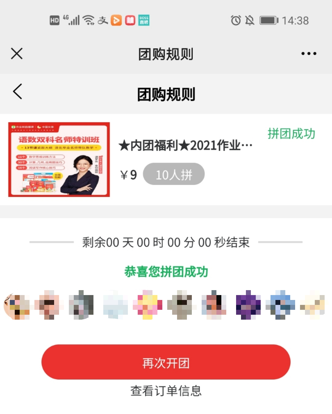 拼团成功:成团人满且都支付成功,此时一个团购ID对应三个订单ID。