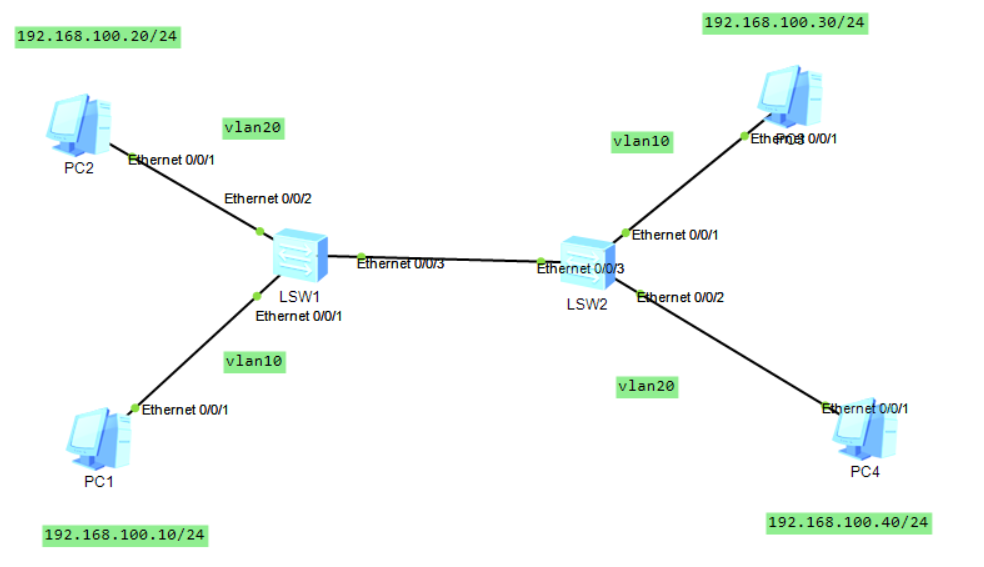 [SW2-Ethernet0/0/2]port default vlan 20 //给接口默认划分vlan20,只让vlan20进入[SW2-Ethernet0/0/2]undo shutdown //开启接口