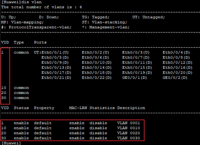 [Huawei]dis vlan //查看vlan信息表