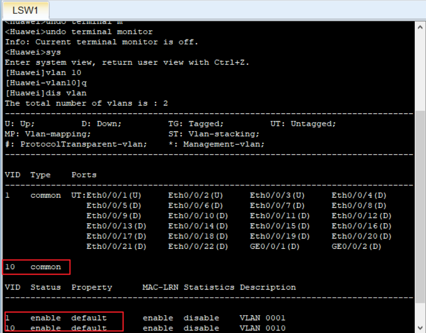 [Huawei]vlan 10 //创建VLAN 10