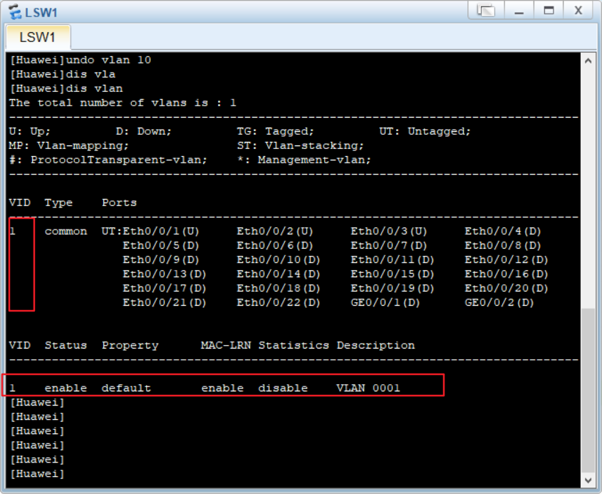 [Huawei]undo vlan 10 //删除VLAN 10